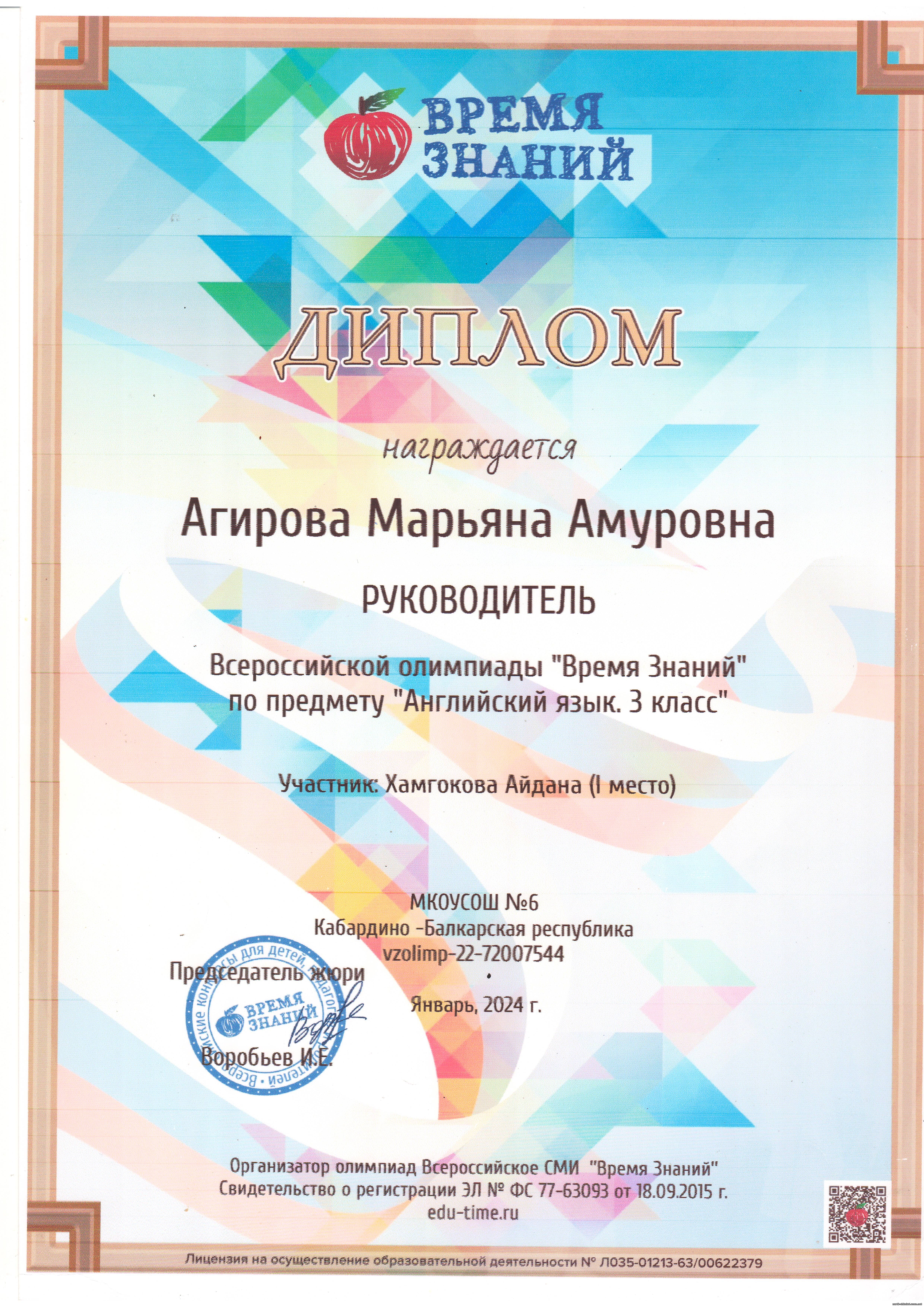 Всероссийская олимпиада "Время знаний" по предмету "Английский язык. 3 класс" Участник: Хамгокова Айдана (1 место) - диплом (1 место)