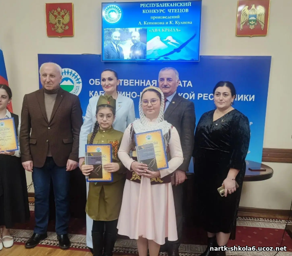 По итогам третьего тура Республиканского конкурса чтецов произведений А. Кешокова и К. Кулиева «Два Крыла» победителями стали и заняли первое место следующие участники конкурса ученица 5 «Б» класса Хамгокова Айдана - руководитель Тохова Р. М., ученица 5 «В» класса Гендугова Амира - руководитель Кошиева З. Х.  а также дипломантом ученица 7 «Б» класса Крымшокалова Самира - руководитель Гаштова А. Л.
